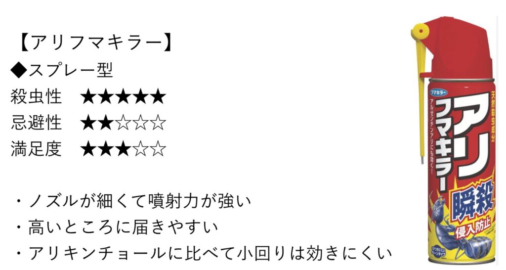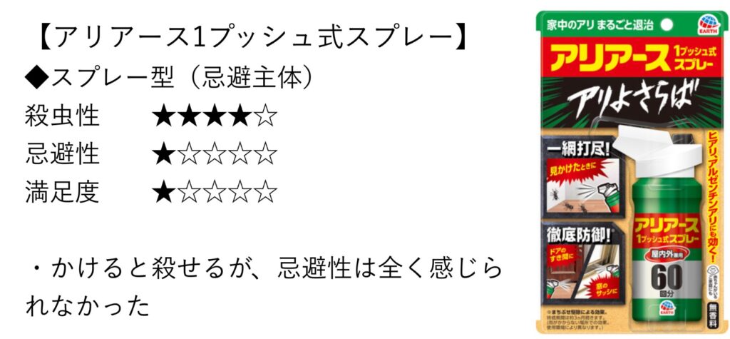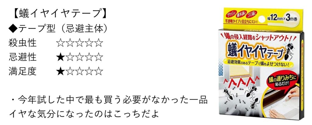 アリとの戦いを通じてわかったこととして、「製薬会社が謳っている忌避効果は全く信用できない」というものがある。「アリの侵入を防ぐ効果がある」と記載されているスプレーは、殺すことはできても忌避にはほとんど効果がなかった。テープ状になったものも試してみたが、これは効果がなかった。薬剤の「忌避効果あり」は、飲み会の誘いへの「行けたら行く」という返しと、重みとしてはちょうど同じくらいと思っていただいてよい。