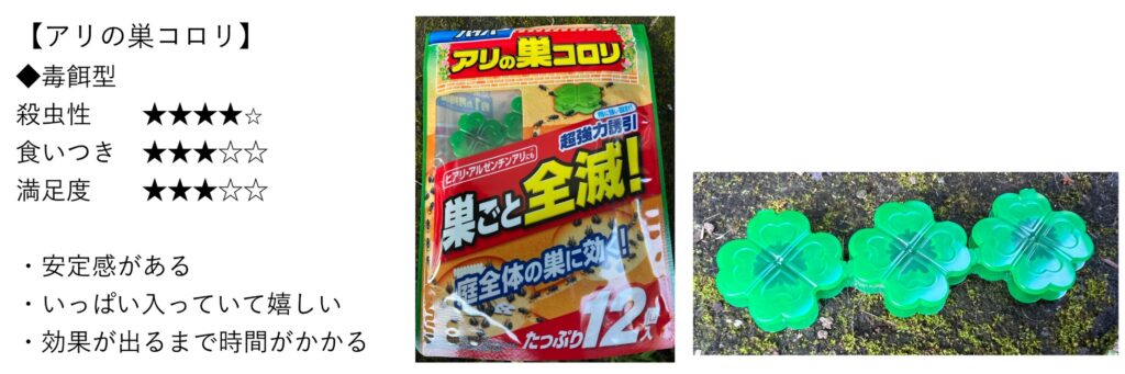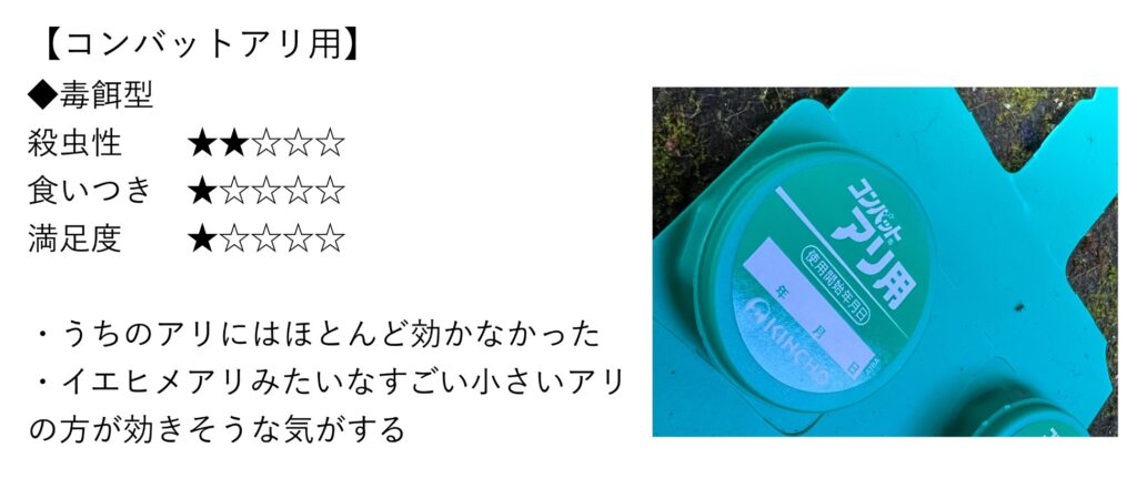 私は毎日のように毒餌を仕掛け、アリたちの様子を観察した。その結果、だいたい餌の設置から5〜6日経つと、その場のアリはある程度いなくなることがわかった。しかし、また数日すると復活する。効果は一時的なもので、根絶はけっこう難しいものだということがわかった。