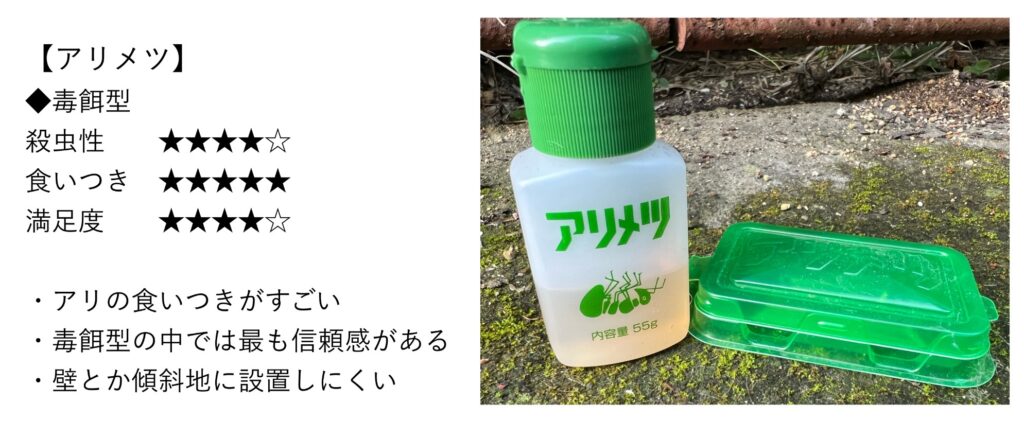 特にアリたちに人気だったのが「アリメツ」で、見るからに甘そうなシロップ状の液体が、アリたちの食欲を刺激する。垂らしてから1〜2分で黒山の人だかり、いやアリだかりができる、非常に人気の商品だった。