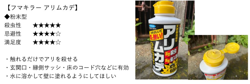 唯一効果的だったのは、「粉末タイプ」の薬剤である。これは、粉が触れた瞬間にアリを殺すというものであり、忌避というよりは殺虫効果なのだが、結果的にアリの侵入を防ぐことができれば同じようなものだ。玄関口や縁側のサッシなどに撒くことで、アリの侵入をシャットアウトすることができた。しかし壁や天井裏には撒けないので、万能とは言い難い。
