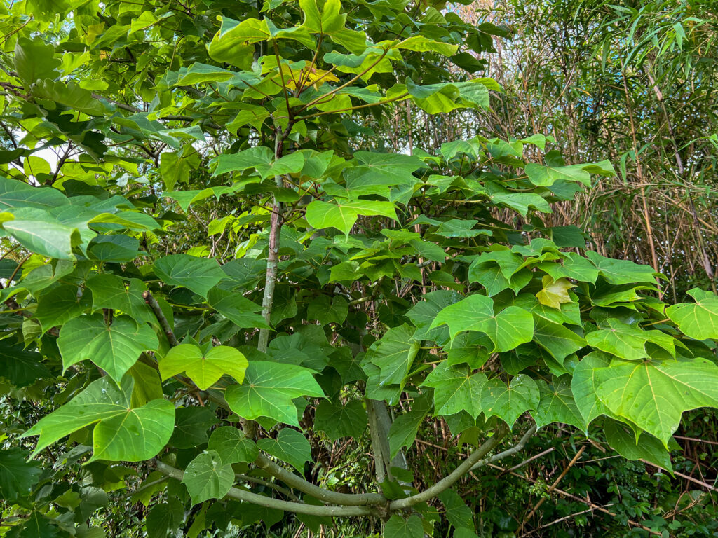 ・手のひらのような形をした、10〜30cmぐらいの大きな葉がつく