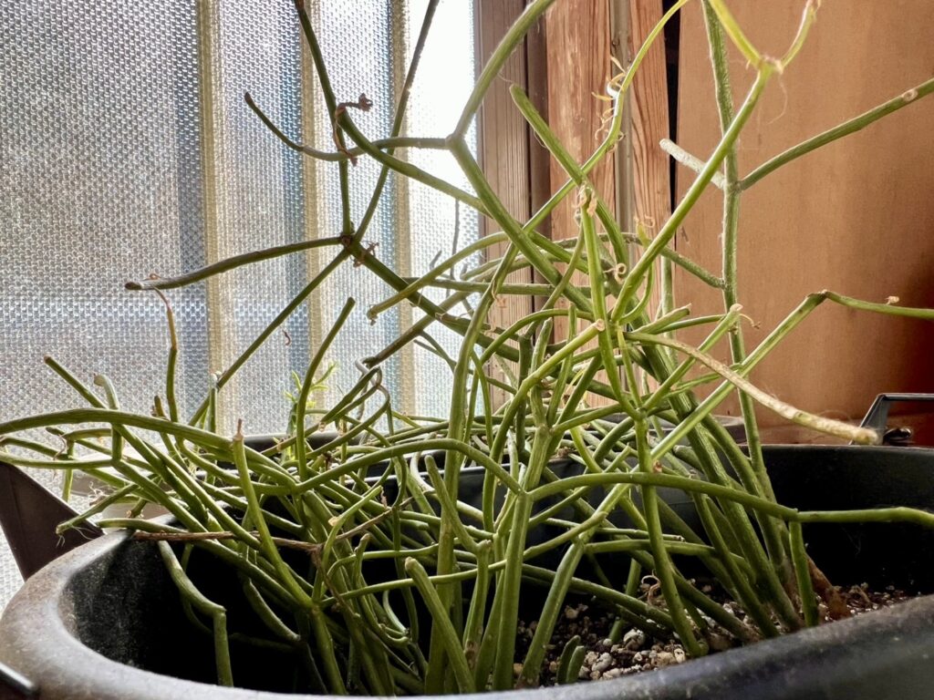 ビョンビョンと不規則に枝が広がり、それらが奔放にどんどん伸びていく。気温や栄養状態がいい状態だと、先端付近に小さな葉っぱがぴょこぴょこと付くようになる。なぜか愛着が湧き、これだけは1年ほど生き延びている。