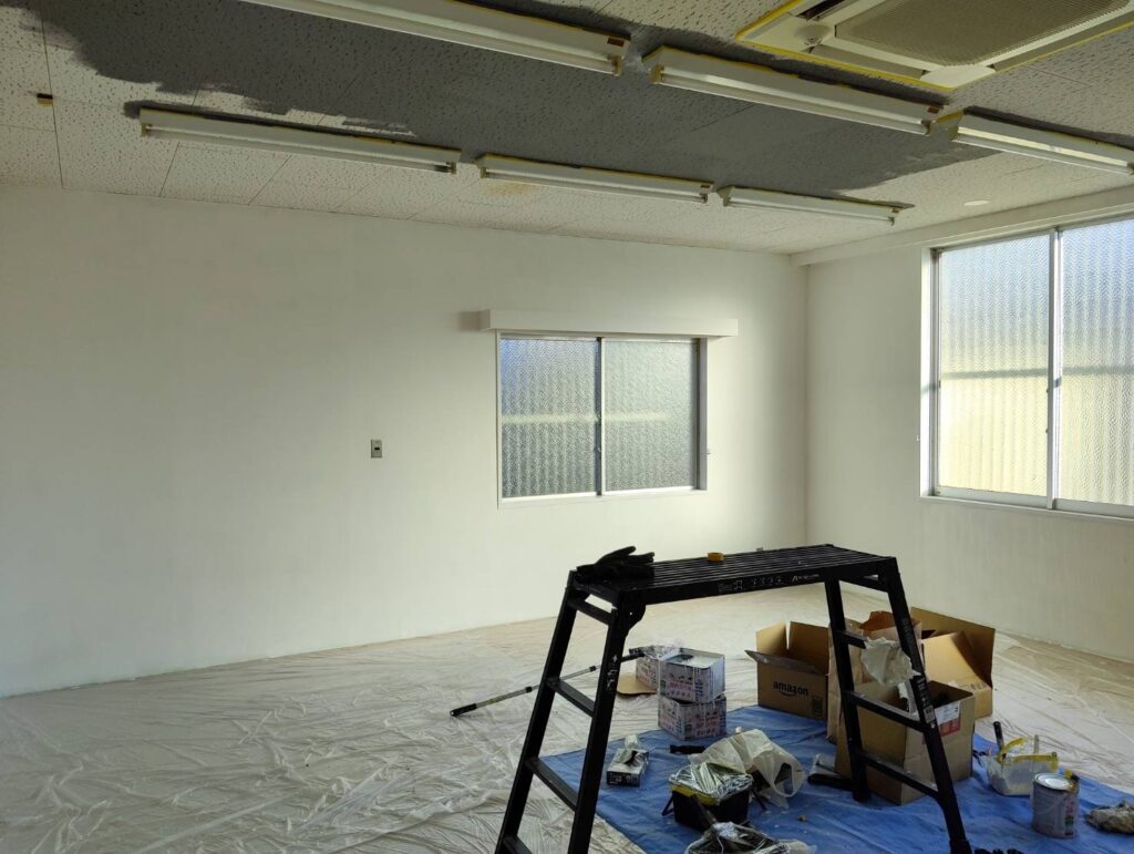 壁塗りが完了し、天井の塗装に入ったところ