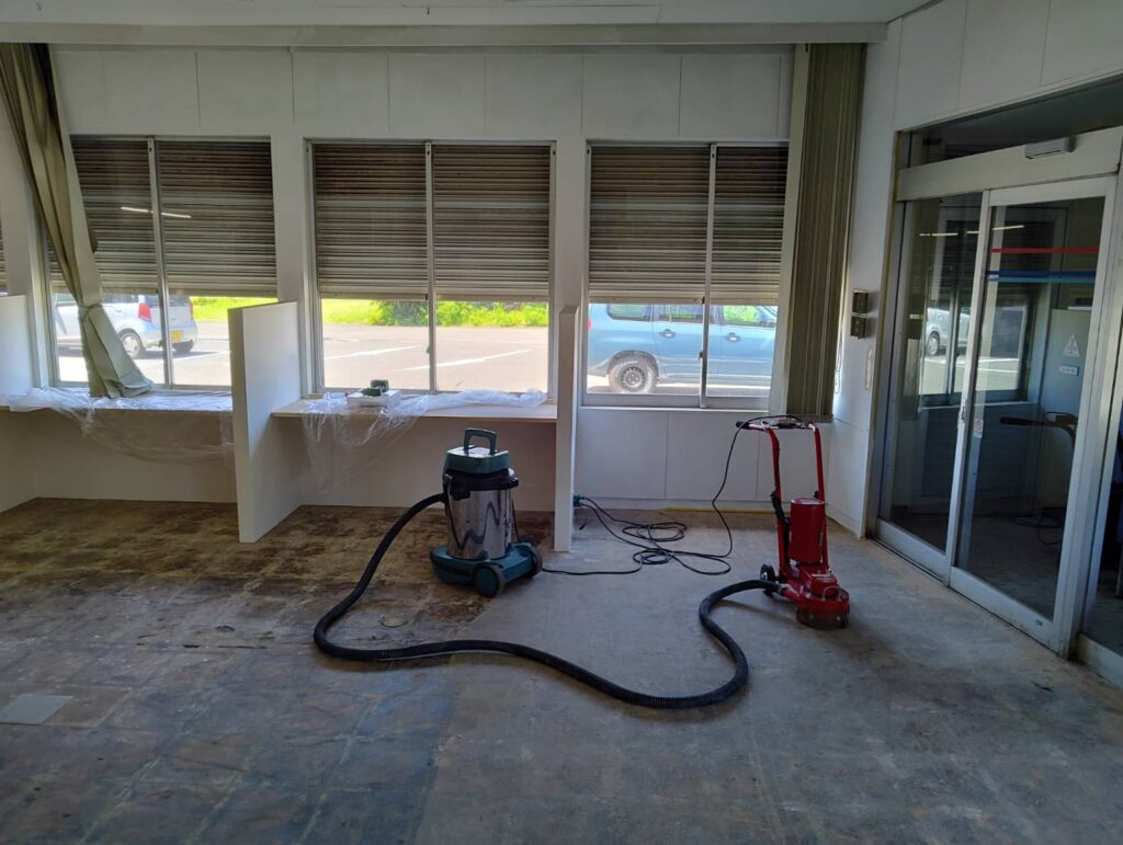 ・床:タイルめくり、研磨、コンクリート強化剤の塗布(摩耗やひび割れの防止、粉塵の発生防止につながる)