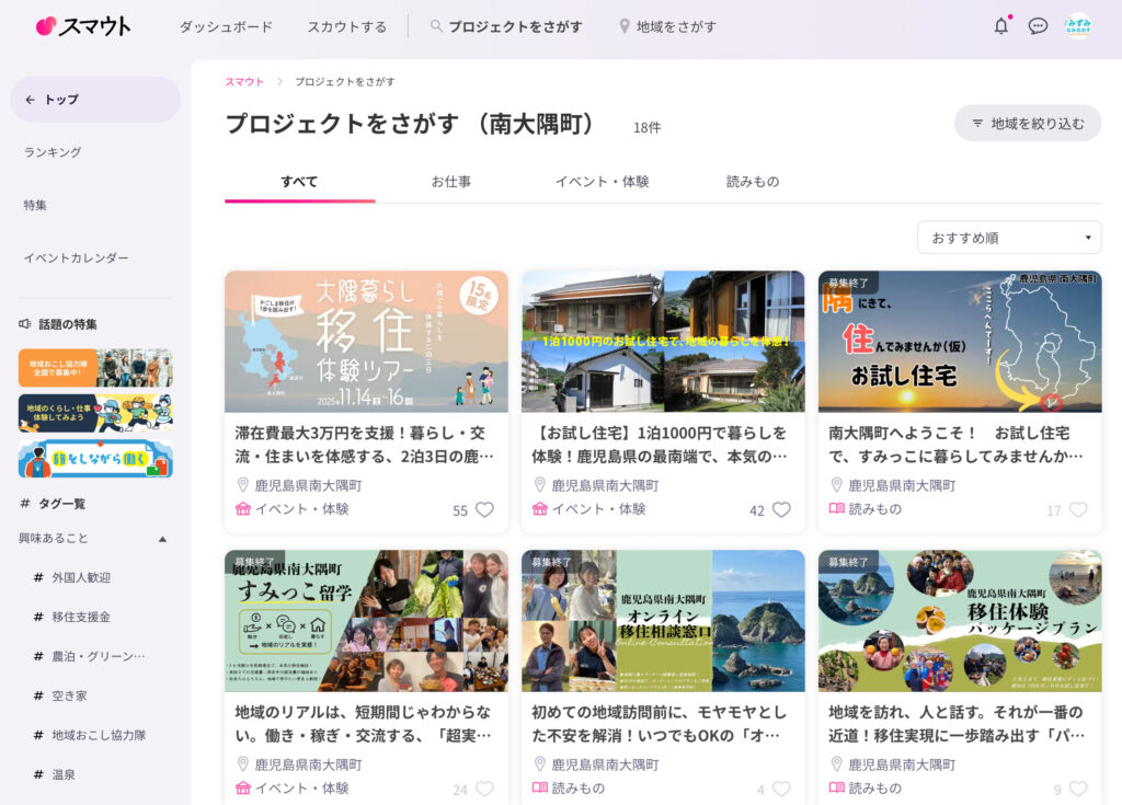 全国1100以上の地域・7万人以上のユーザーが登録しており、地域づくり・移住定住関係では国内最大規模のWebサイトの一つです。
